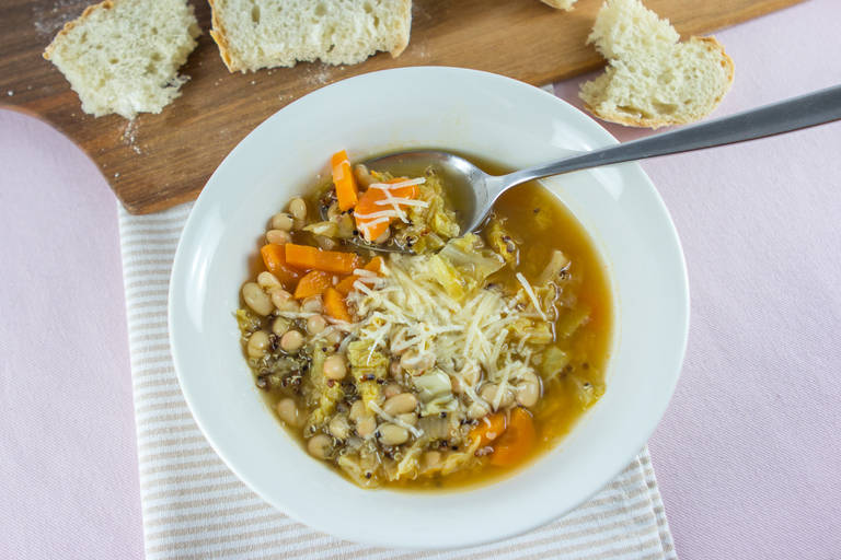 Recept za okusno zelenjavo juho z ohrovtom, fižolom in kvinojo.