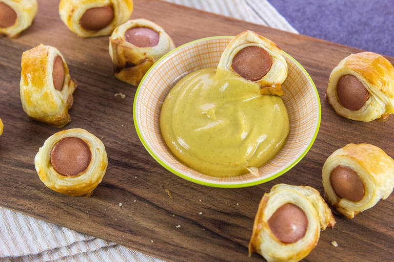 Recept za hiter in okusen prigrizek iz listnatega testa, hrenovk in gorčice.