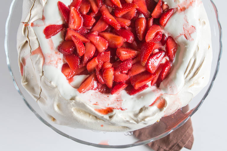 Recept za krhko torto iz beljakov s svežimi jagodami in smetanovo kremo.