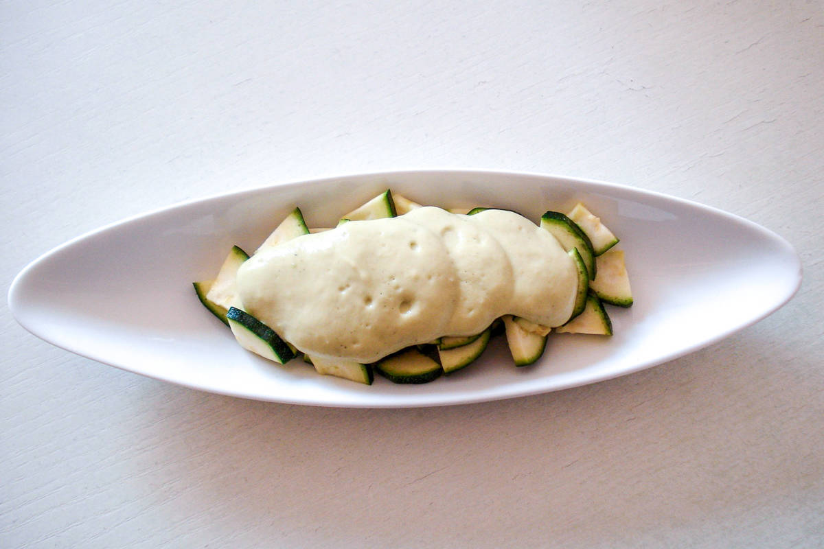 Recept za bučke s prelivom iz avokada, mleka in gorčice.