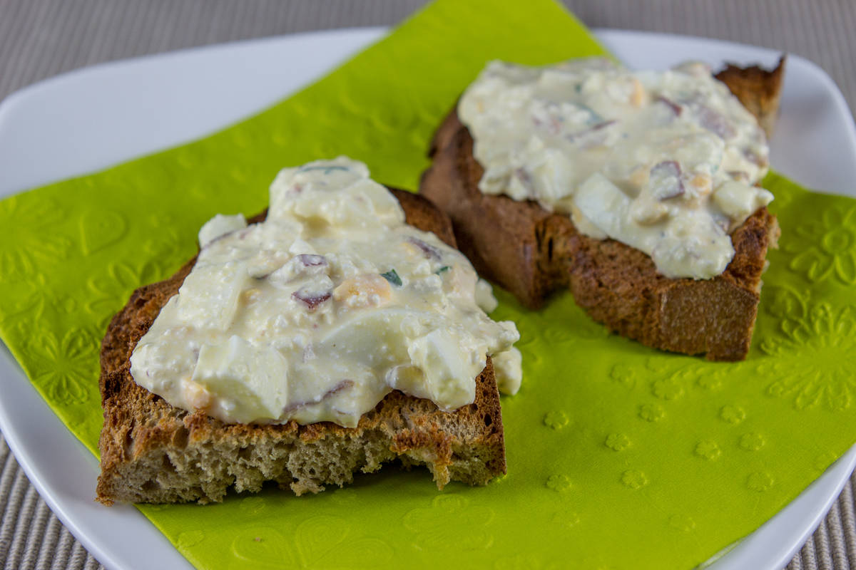 Recept za namaz iz trdo kuhanih jajc, popečene slanine in skute.