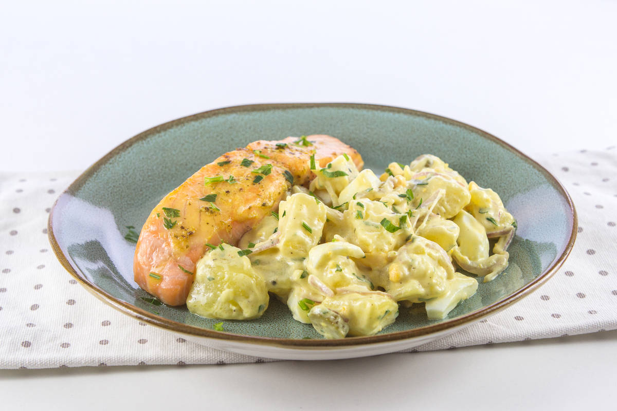 Recept za krompirjevo solato z majoneznim prelivom, trdo kuhanimi jajci in čebulo.