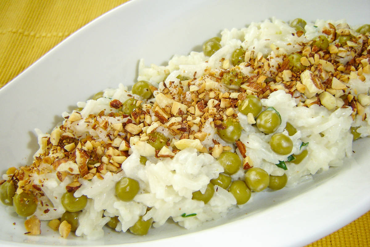 Riž stresemo na krožnik in posujemo s praženimi mandlji.