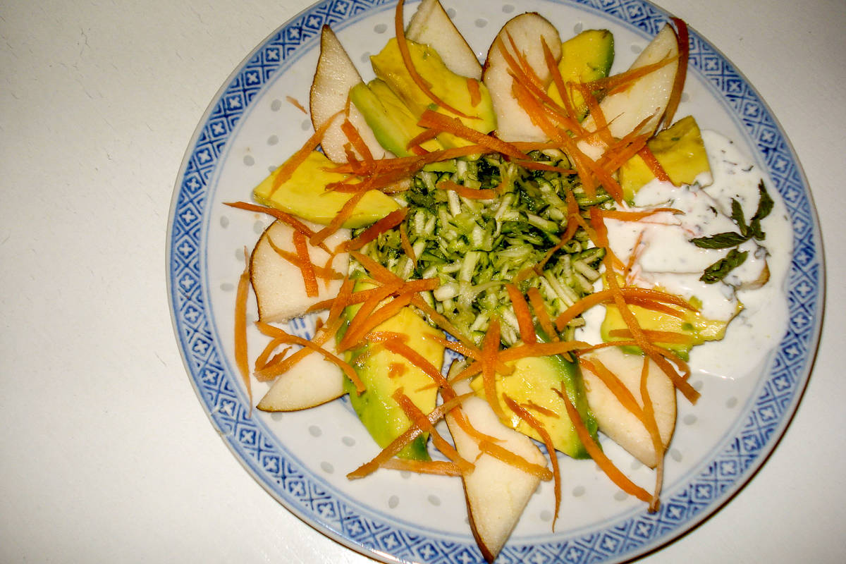 Recept za solato iz avokada, hruške, korenčka in bučke.