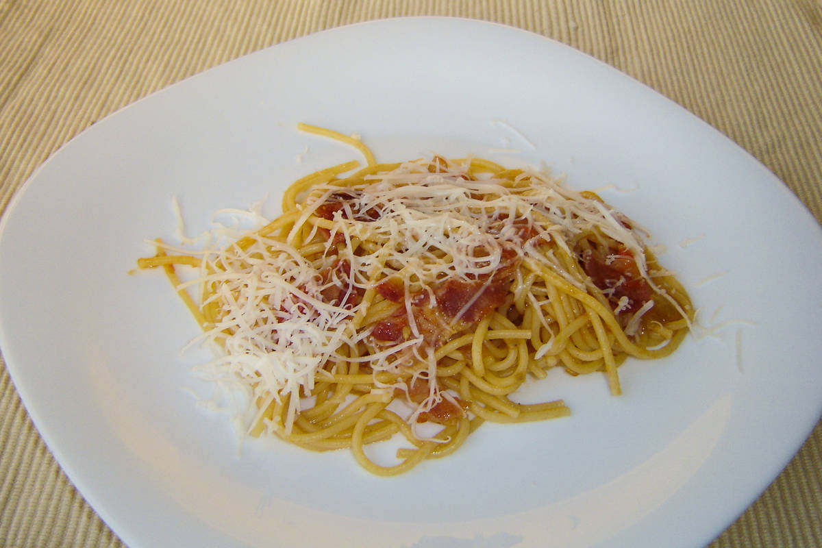 Špagete zmešamo z omako in potresemo z naribanim ovčjim sirom.